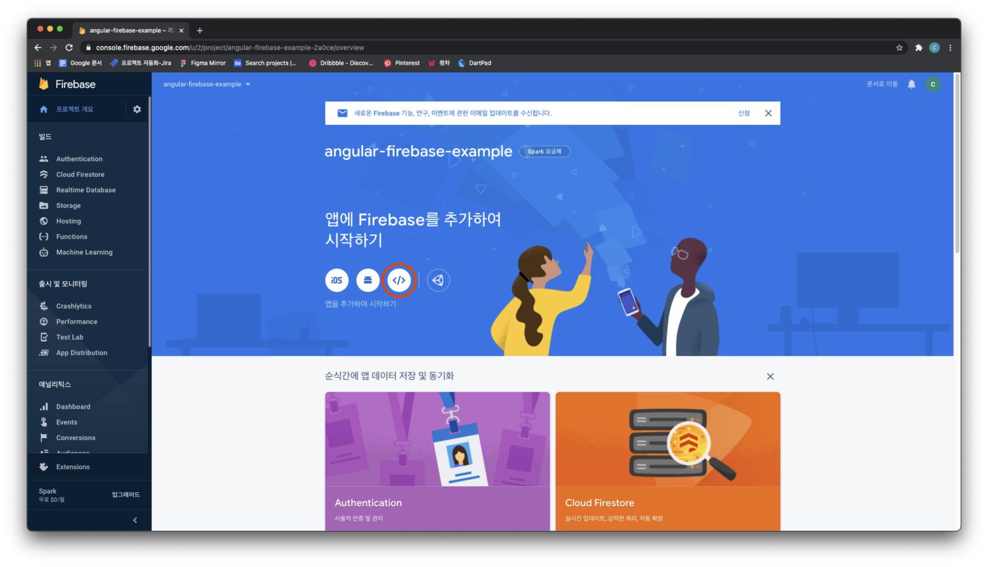 파이어베이스 프로젝트 생성이 완료 되면 아래의 화면에 나와있는 </> 웹 아이콘 버튼을 클릭해서 웹 앱에 Firebase 추가를 해준다.