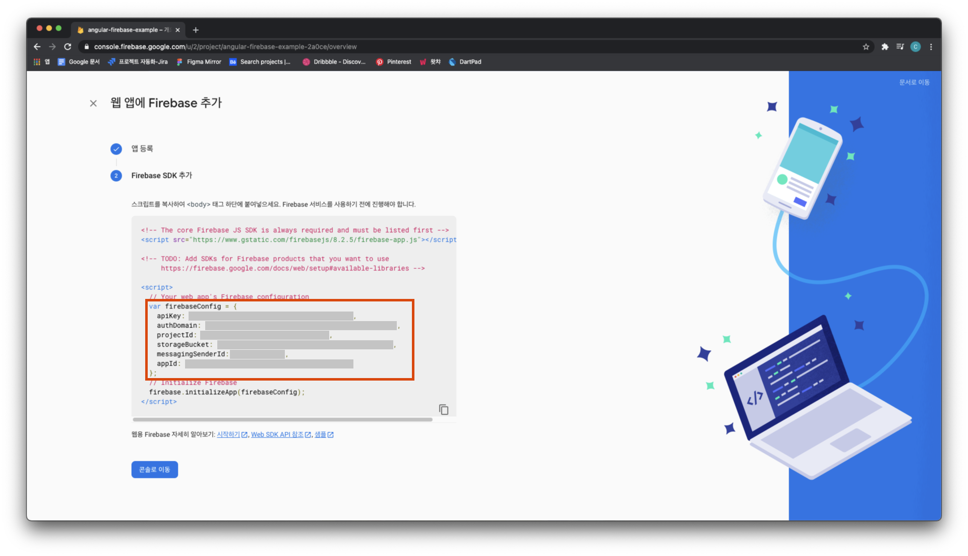 나오는 코드에서 firebaseConfig를복사를 해준다.