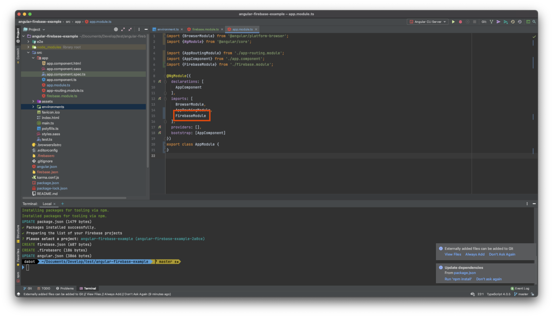 그리고 src > app > app.module.ts 의 imports 부분에 생성한 FirebaseModule 을 추가해준다.