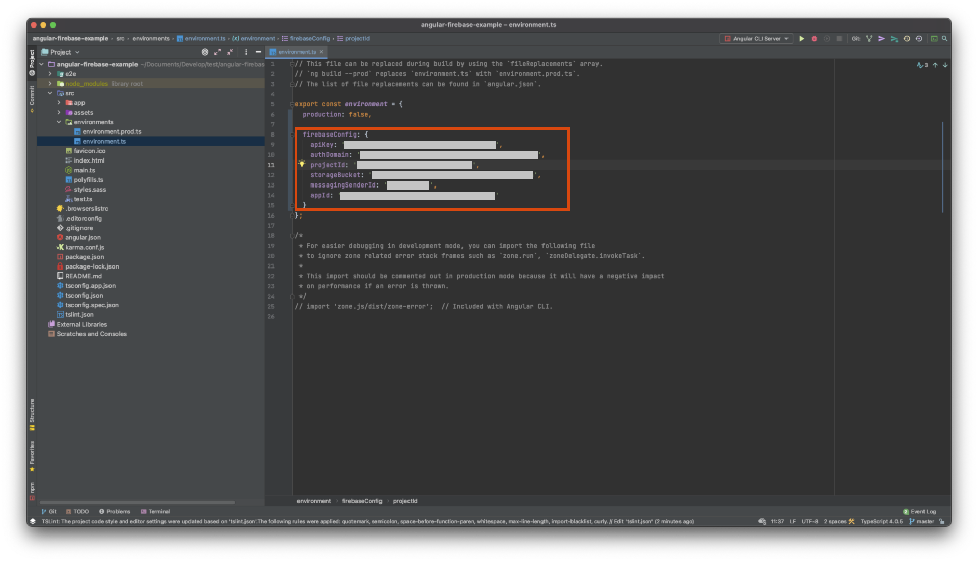 그리고 앞서 생성한 Angulre 프로젝트 폴더의 src > environments > environment.ts 를 열고 아래와 같이 입력을 해준다.