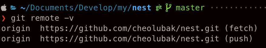 아래를 보면 origin이라는 원격 저장소에 fetch와 push에 https://github.com/cheolubak/nest.git 에 연결되어 있는걸 볼 수 있습니다.