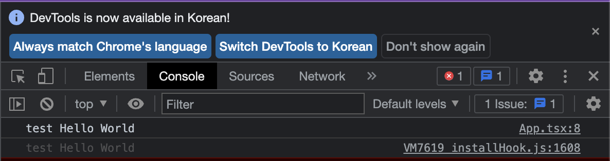 위와 같이 Hello World라는 값을 가진 REACT_APP_TEST를 만든 후 console을 통해 확인을 해보겠습니다.