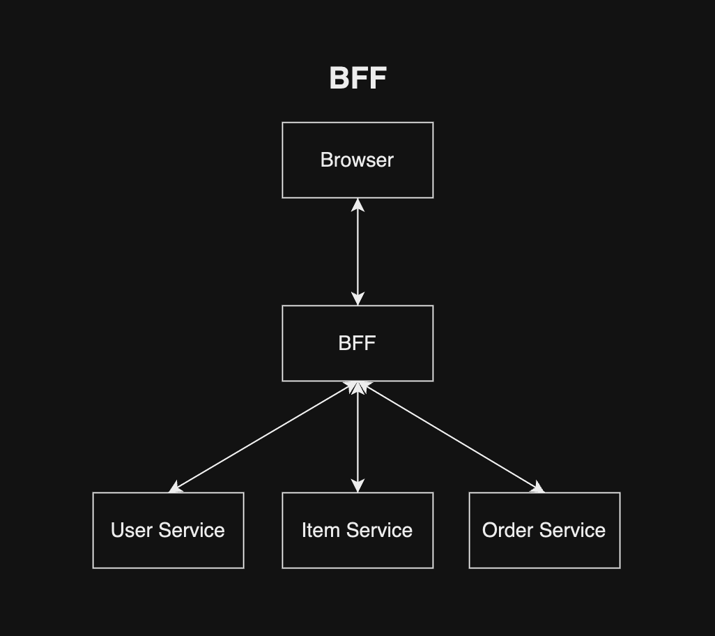 위의 경우를 해결하기 위해 등장한 것이 BFF입니다. BFF란 Backend For Frontend의 약자로, 말 그대로 프론트엔드를 위한 백엔드를 의미합니다. 즉, 프론트엔드를 요구사항에 맞게 구현하기 위해 도움을 주는 백엔드라고 간단하게 정의할 수 있습니다.