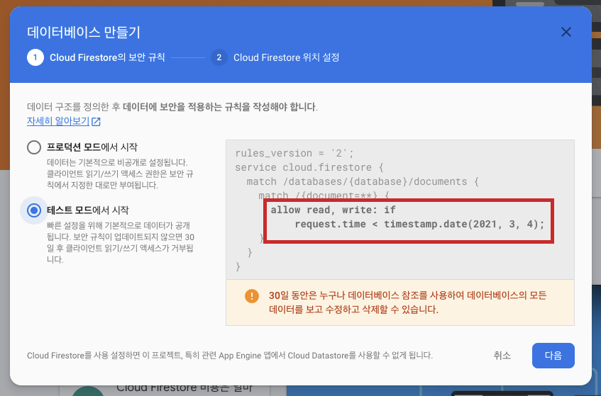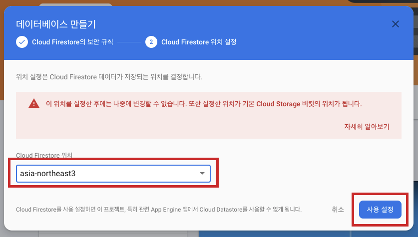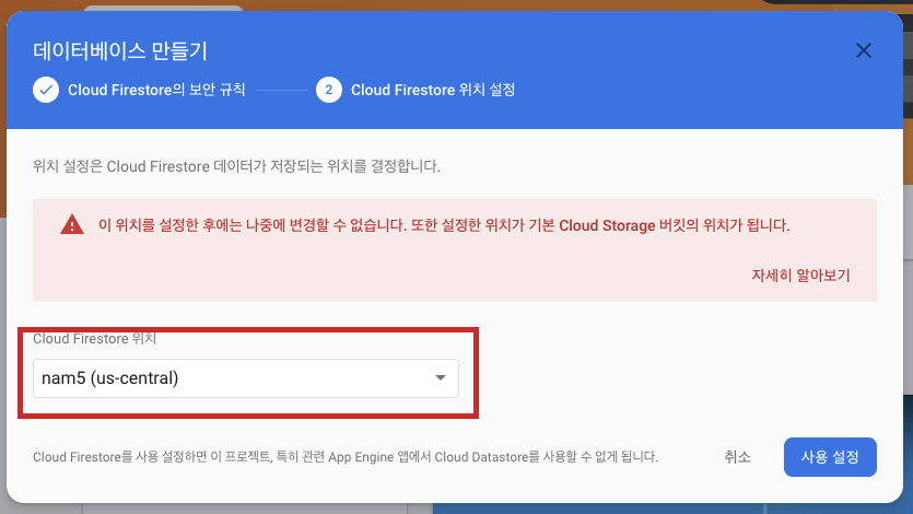 그리고 다음에 Cloud Firestore의 위치를 설정하는 창이 나옵니다.