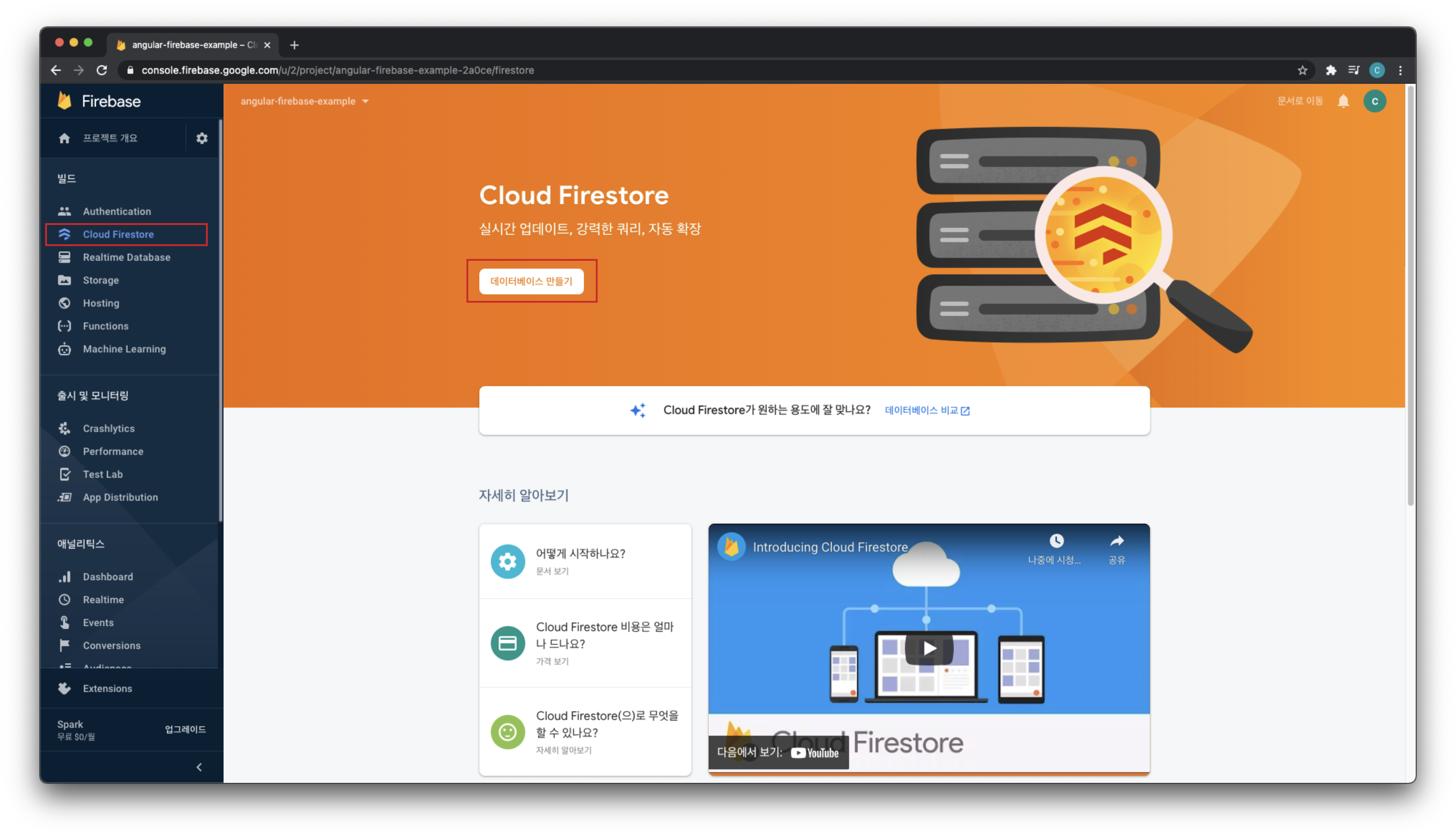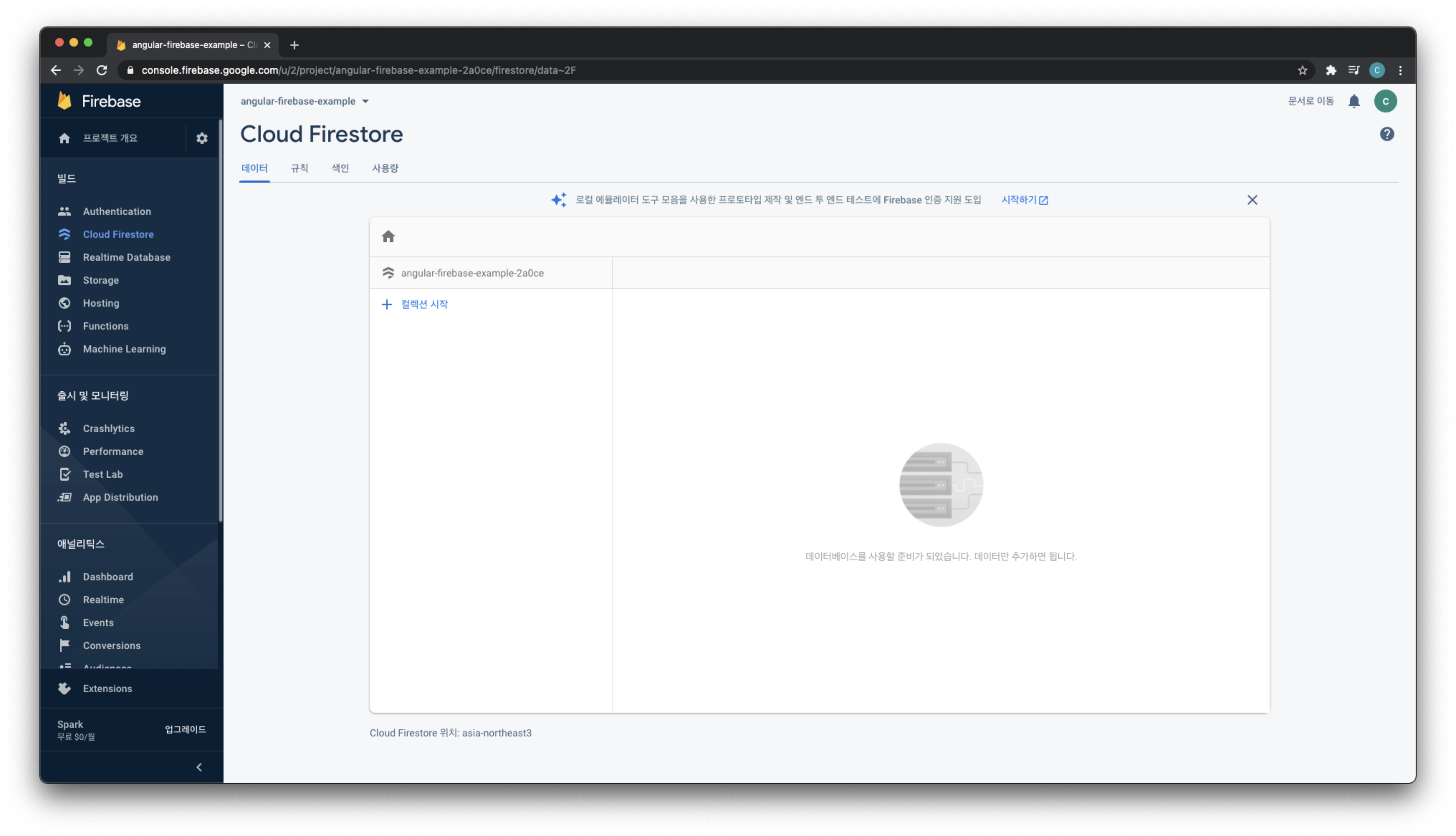 먼저 Firebase 콘솔로 가서 Cloud Firestore를 사용하도록 설정을 합니다.